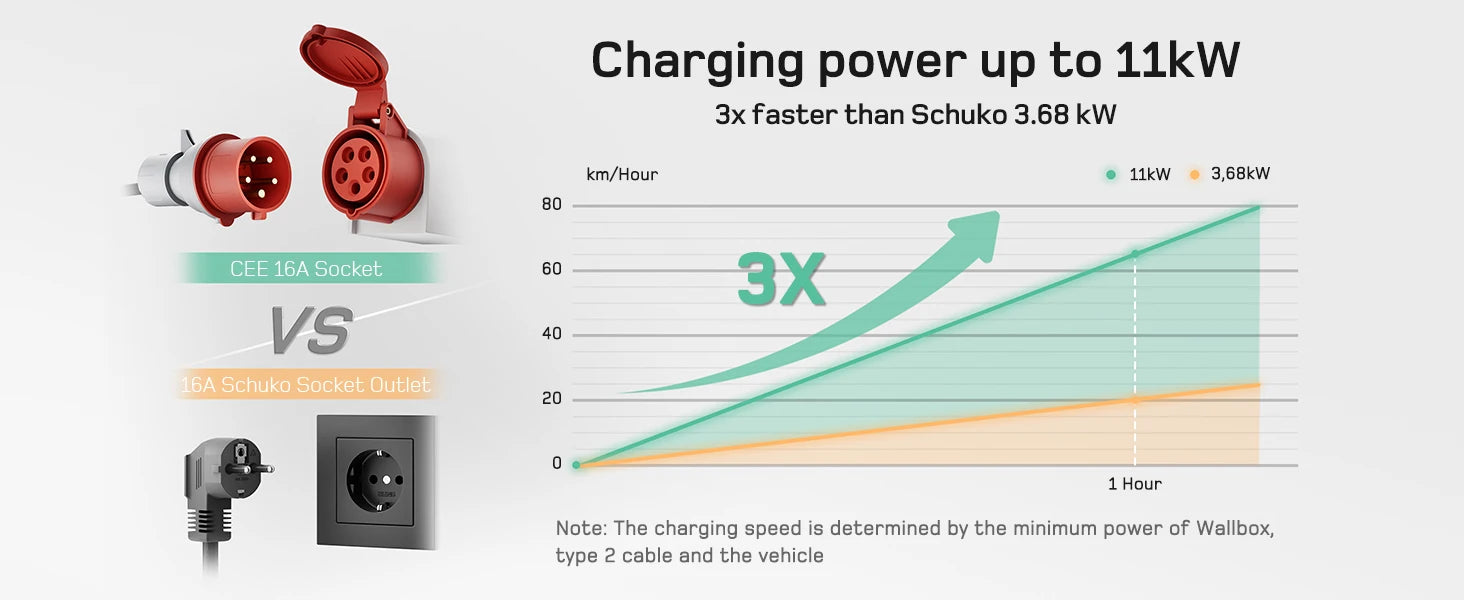Providing maximum 11kW power for efficient charging.(16A, 3-phase)