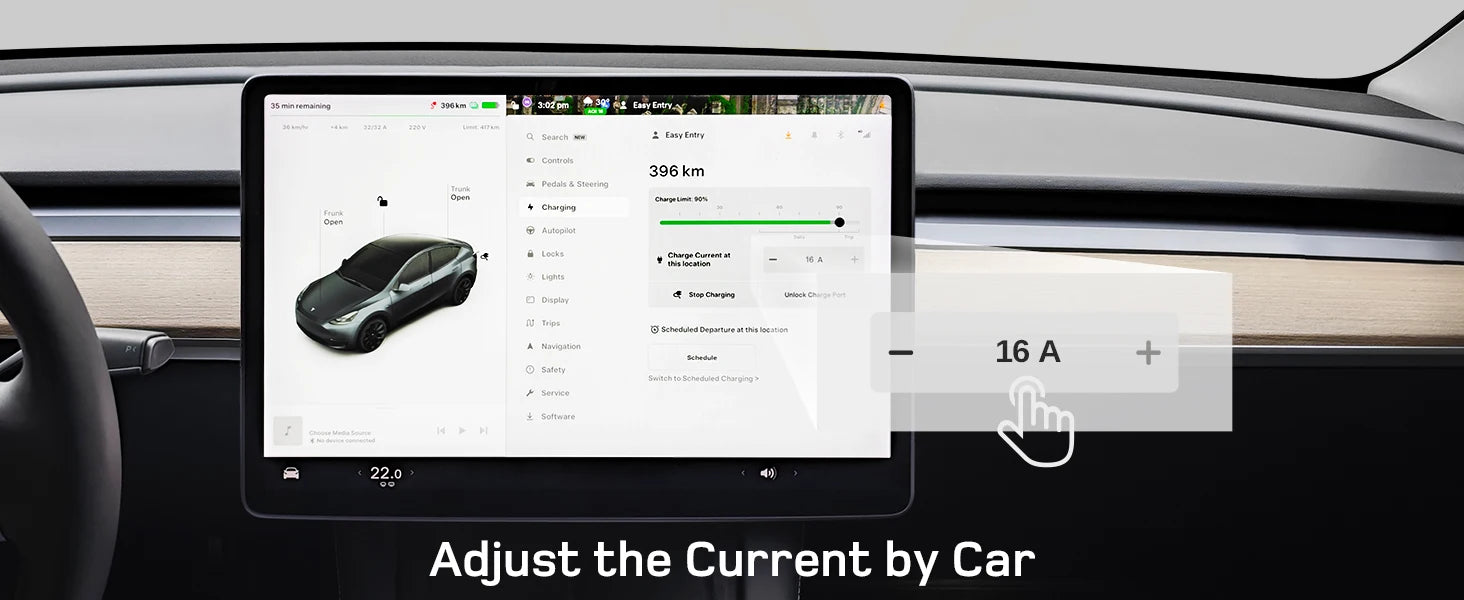*Adjustable Charging Current * Adjust the current with one touch 11kW(6A/8A/10A/13A/16A)/ 22kW(6A/10A/13A/16A/20A/24A/32A). The delayed charging time can be adjusted by holding button (0.5 hours - 8 hours). No cumbersome operation via the app, easy adjustment directly on the wallbox.
