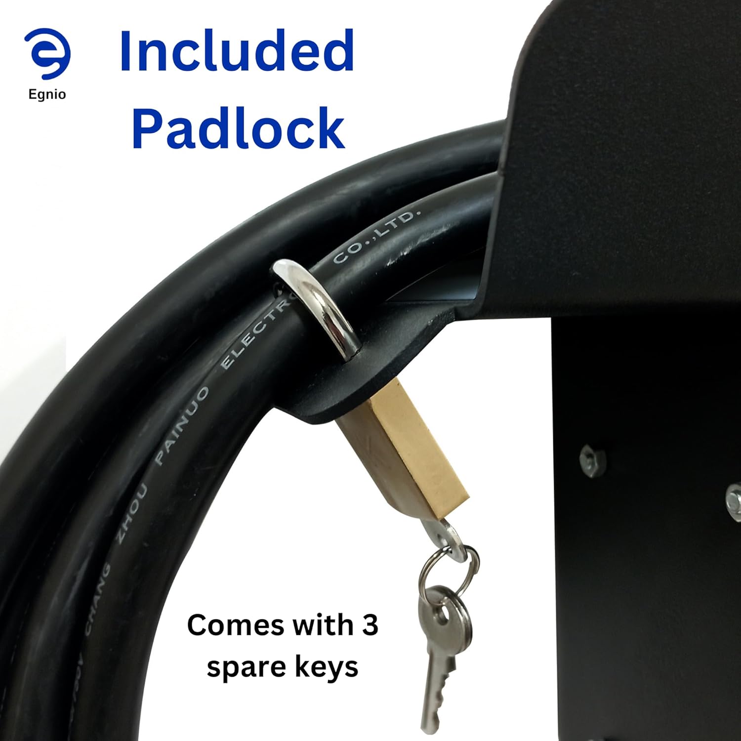 The Egnio EV Car Cable Holder Lockable, the ultimate solution for organizing your EV charging setup. This innovative product serves as an EV cable holder, EV car charger holder lockable, and EV cable holster all in one. With its space-saving design, included padlock for added security, and rain-proof umbrella design, it offers comprehensive protection and convenience for your electric vehicle charging needs. Crafted from robust 2.5mm metal, this holder can support weights up to 50kg, ensuring durability and reliability. Its wall mount design and easy installation process make it a neat and tidy solution for keeping your charging area organized. Invest in the Egnio EV Car Cable Holder Lockable today and experience the ultimate peace of mind while charging your electric vehicle.
