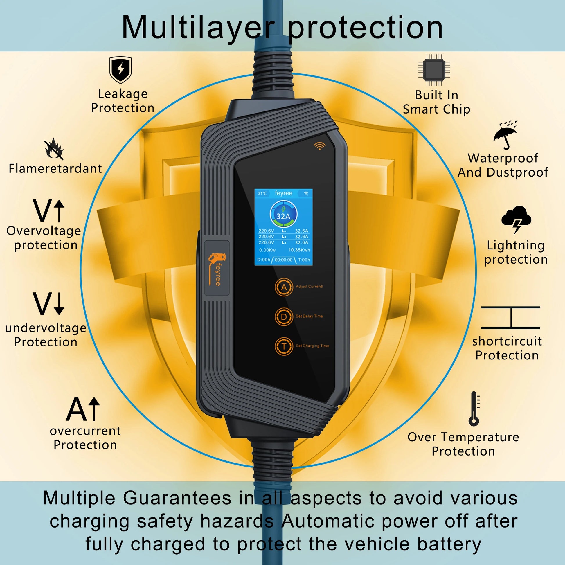 【Secure charging】Our chargers have safety protection measures such as overcurrent protection, overvoltage protection, undervoltage protection, leakage protection ( TypeB AC30mA + DC6mA ) , and overheating protection, with a waterproof grade of IP66.