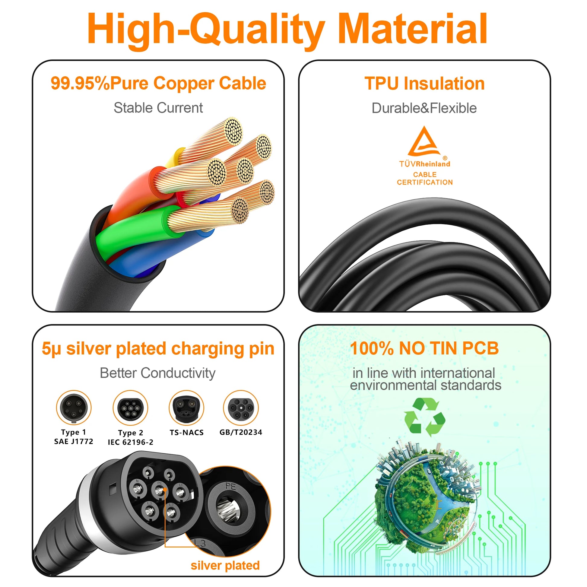 【High flame retardant material】The gun head,cable and shell are all made of high flame-retardant materials,which meet the UL94V-0 fire protection rating ,can effectively prevent fire hazards ensure safe charging.