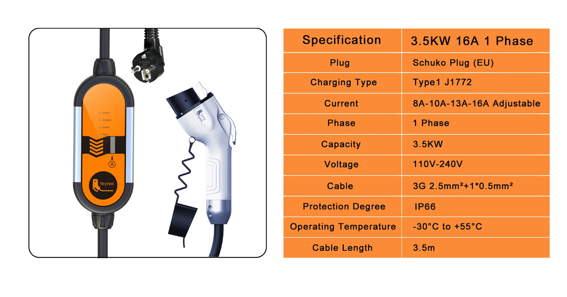 feyree Portable EV Charger Type2 IEC62196-2 16A EVSE Charging Cable Type1 SAE J1772 EU Plug Controller Wallbox for Electric Car