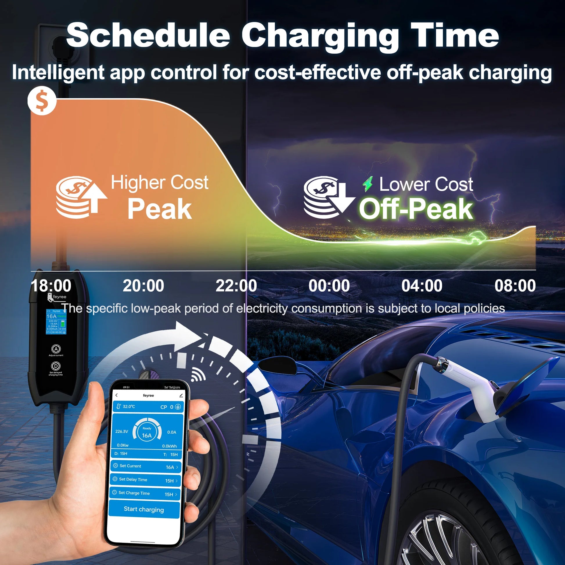 【Smart APP Control】Easy to control and monitor the charging status remotely through the APP: you can adjust the current from 8A-16A, set charging time for 1-15 hours, and set a delayed charging time to charge during off-peak hours to reduce electricity costs.