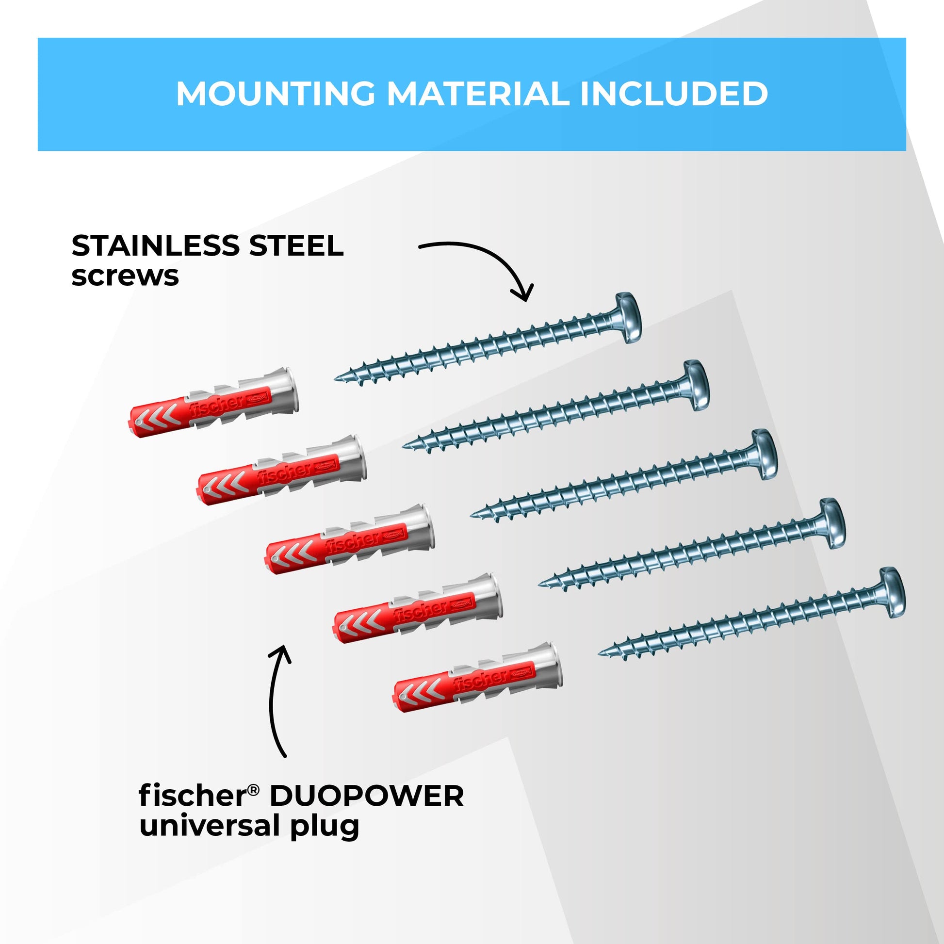 Stainless steel screws and brand-name universal plugs ensure a secure hold on the wall