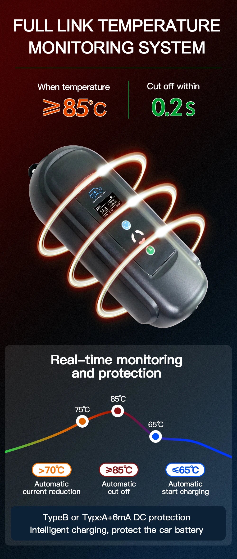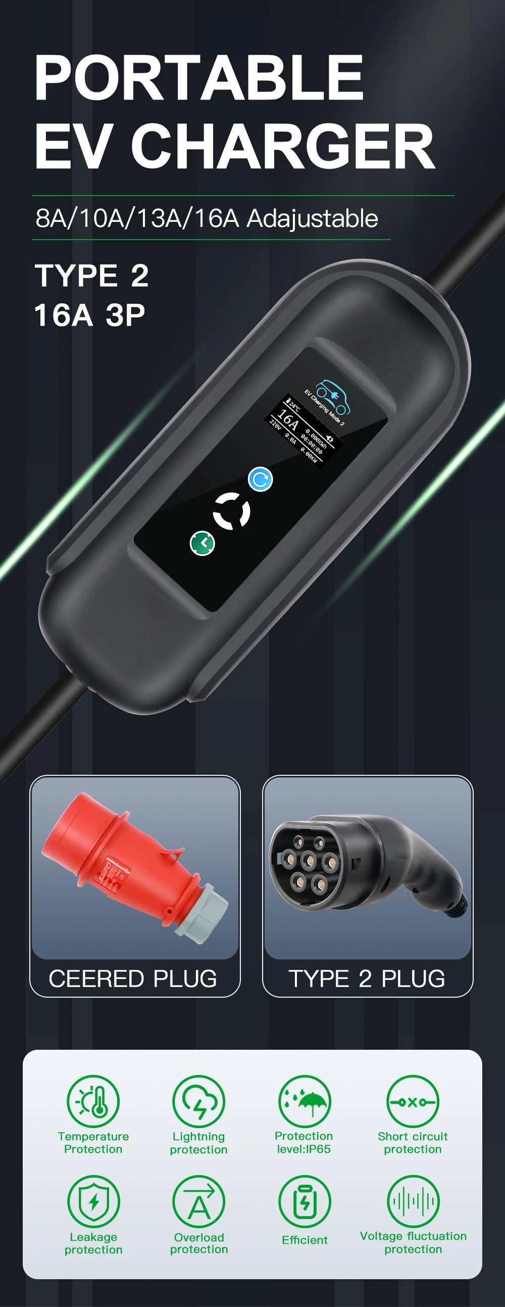 Portable 11KW 16A EV Portable Charger Type2 IEC62196-2 EVSE Charging Box Electric Vehicle PHEV Cars Charger CEE Plug 5M Cable